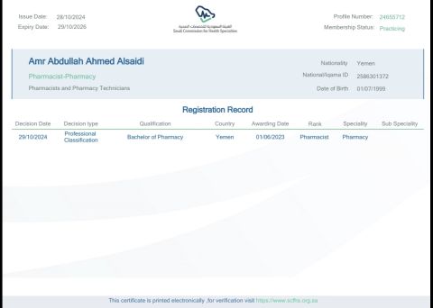 صيدلي، يمني، عازب، حاصل على تصنيف الهيئة السعودية للتخصصات الطبية والتصريح ساري، متواجد في الرياض ابحث عن فرصة عمل، جاهز لنقل الكفالة ومستعد للعمل بأي محافظة، امتلك أكثر من عامين من الخبرة العملية، متخصص في الرعاية الدوائية، وتدقيق الوصفات الطبية وصرف الادوية، وتثقيف المرضى، وإدارة المخزون، وتحقيق نمو المبيعات ضمن بيئة الصيدليات المجتمعية، ومعرفة عميقة في مجال الصيدلة التجميلية والعناية بالبشرة