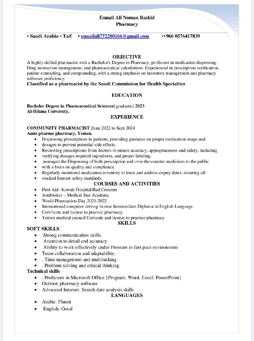صيدلي يمني حاصل على درجه البكالوريوس صيدلة وحاصل على تصنيف مهني ساري من الهيئة السعودية للتخصصات الصحية متاح للعمل فورا بدوام كامل أو جزئي في أي مكان داخل المملكة