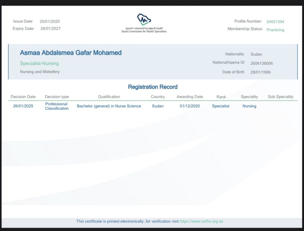 I am Asmaa Abdalsmea Gafer, Mohamed (Registered staff nursing specialist) I am from Sudan ( E R General words) I have Saudi license and I am in "Taif" now ready for transferring my sponsorship