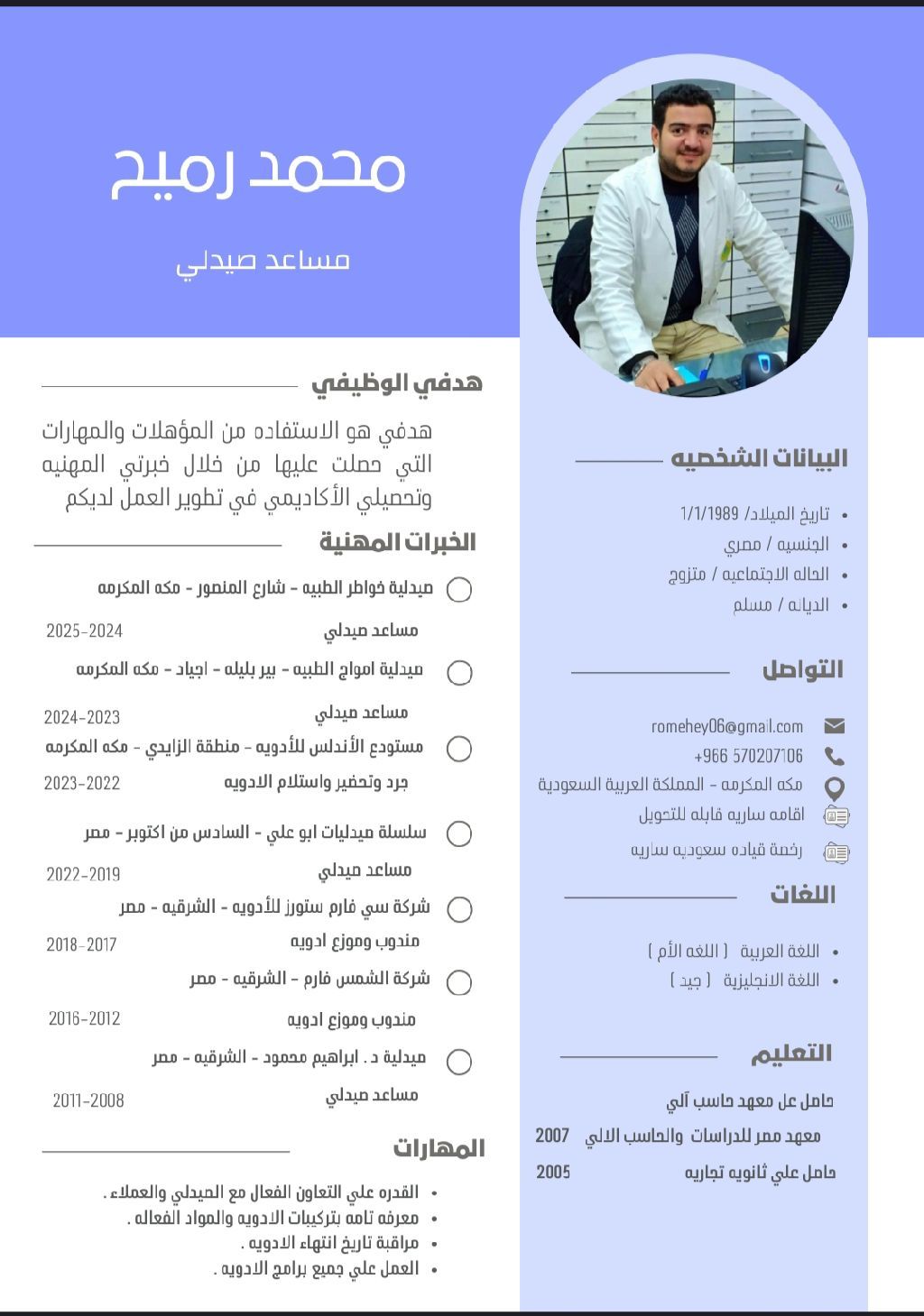 ابحث عن فرصة عمل مندوب وموزع ادوية خبرة 6 سنوات ومساعد صيدلي خبرة أكثر 13 سنة داخل مجال الادوية وعلي علم بالمواد الفعاله والشركات والتعامل مع برامج الادوية وأجيد اللغة الانجليزية مقيم حاليا في مكة المكرمة إقامة سارية قابلة للتحويل