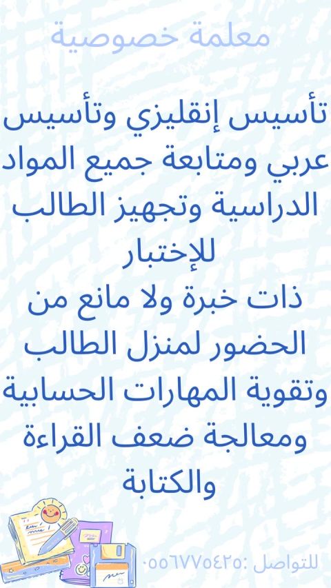 نوفر أفضل معلمات ومعلمين خصوصي بالمملكة يطلعون البيت بأسعار مناسبة تأسيس القراءة والكتابة والأملاء ومتابعة مواد الابتدائي والمتوسط والثانوي للمنهج الحكومي والانترناشونال والأهلي مع حل الواجبات وشرح الدروس ومراجعة الدروس. متخصصين وخبرة طويلة في التدريس وتوصيل المعلومة بطريقة سهلة مجربين من الأهالي وعليهم مدح من الأمهات. تميز وانضباط في الوقت. كلميني واتساب اعطيكي رقم معلمة / معلم في نفس الحي