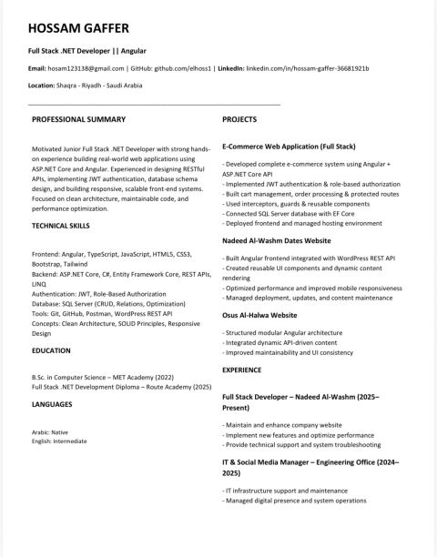 مطور Full Stack متخصص في Net وAngular، لدي خبرة في تطوير تطبيقات ويب متكاملة وبناء REST APIs والتعامل مع SQL Server. أحرص على كتابة كود نظيف وقابل للتطوير مع الاهتمام بالأداء وتجربة المستخدم ابحث عن فرصة عمل لتقديم قيمة حقيقية ومستعد للعمل فورا. GitHub LinkedIn