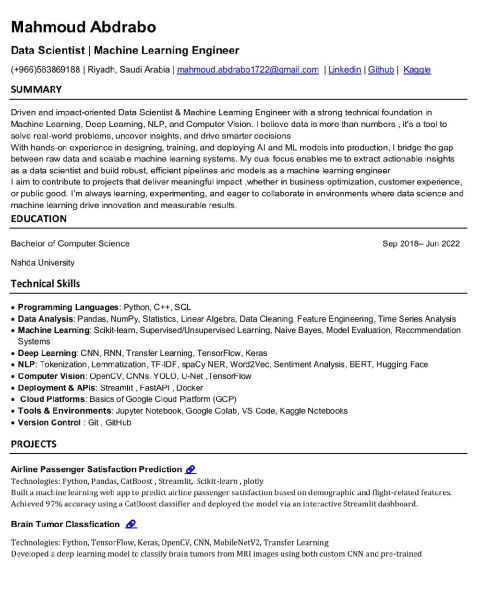 Data Scientist & Machine Learning Engineer Egyptian nationality Available for Work in Saudi Arabia Location Riyadh Experienced Data Scientist and ML Engineer with a strong background in building Smart, scalable solutions using machine learning, deep learning, and natural language processing. Passionate about turning raw data into actionable insights