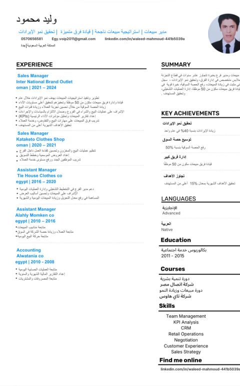 مدير - مشرف مبيعات بخبرة ممتدة لأكثر من 16 عام، B2B & B2C ديناميكي ومحترف في إدارة دورة البيع وتحقيق الأهداف، متميز في إدارة وتطوير الأداء، تحليل السوق والمنافسين، مهارات التفاوض والاغلاق، تطبيق أدوات التقييم العالمية SWOT، وضع وتطوير خطط المبيعات التي تحقق النمو، استخدام طرق البيع Up - selling & Cross - Selling، بناء علاقات متميزة مع العملاء أساسها الثقة التي تعمق الولاء وتضمن الاستمرارية