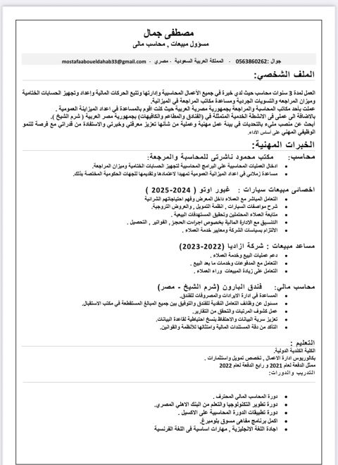 خريج إدارة أعمال طموح أتمتع بمزيج فريد من المهارات التقنية والابداعية. امتلك خبرة عملية متنوعة تشمل إدارة العمليات المحاسبية، ادخال البيانات بدقة عالية، والتعامل المباشر مع العملاء في قطاع المبيعات. ابحث حاليا عن وظيفة مناسبة أقدر أقدم فيها خبرتي ومهاراتي وأتطور بشكل أفضل. عندي شغف بالعمل، والتزام عالي، واستعداد أتعلم واعطي أكثر من المطلوب