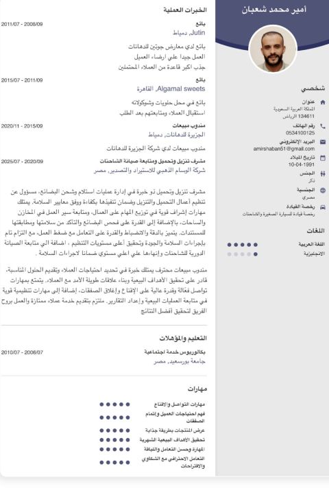 مندوب مبيعات مصري الجنسية خبرة ثلاث سنوات في مبيعات المواد الغذائية في مصر (شركة أقوات للصناعات الغذائية) وعملت في مجال الأقمشة والملابس لمدة عامين، رخصة قيادة سارية، إقامة سارية، جاهز للعمل في أي مكان داخل المملكة