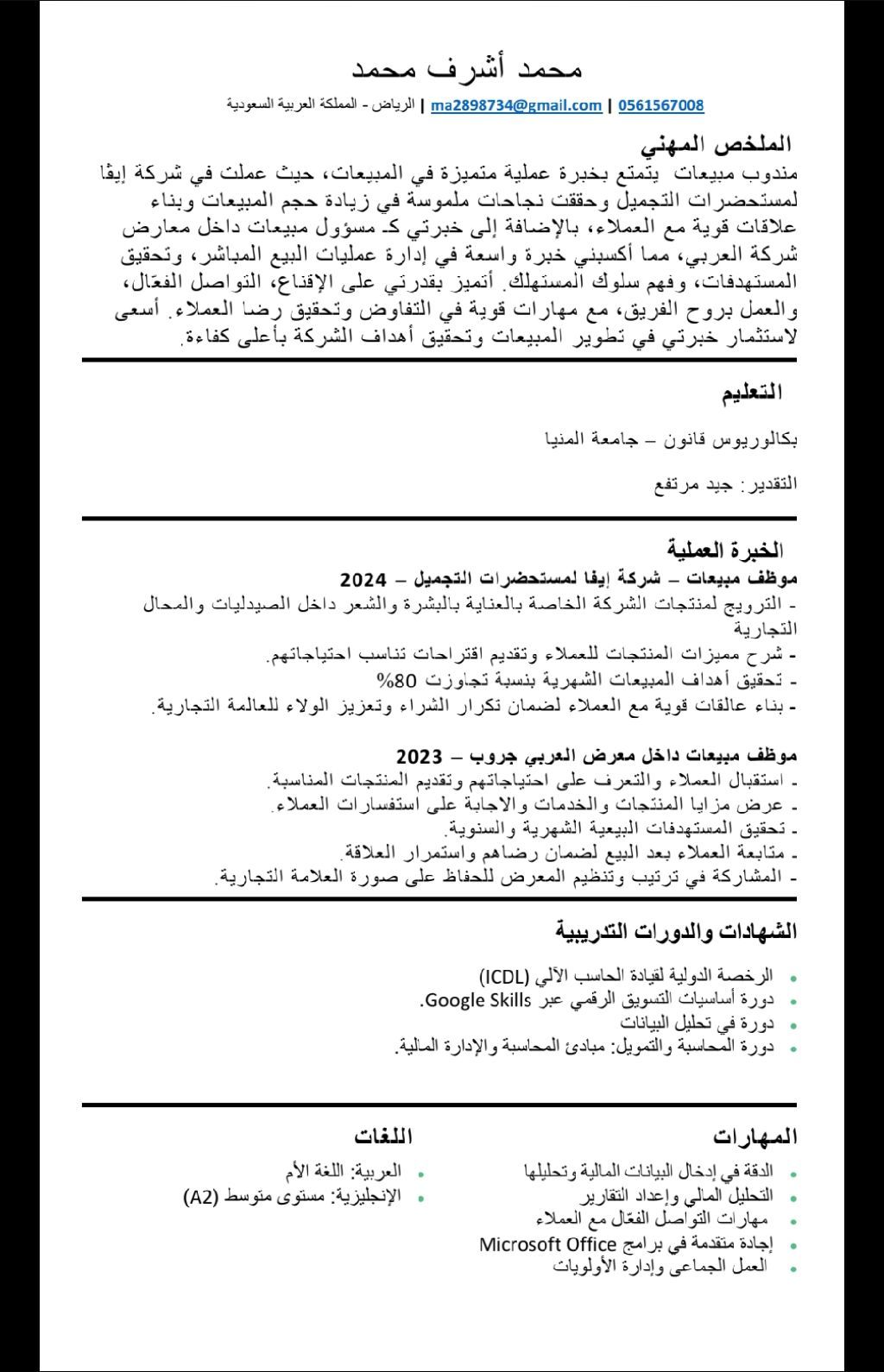 أنا محمد أشرف، شاب طموح امتلك خبرة عملية مميزة في مجال المبيعات والتسويق عملت مندوب مبيعات في شركة أيفأ لمستحضرات التجميل. عملت مسؤول مبيعات في أحد فروع شركة العربي. ما أقدمه لأصحاب العمل تحقيق الأهداف البيعية وزيادة حجم المبيعات. مهارة في بناء علاقات قوية مع العملاء والمحافظة عليهم. القدرة على التفاوض والاقناع واغلاق الصفقات. الالتزام والعمل بروح الفريق وتحت ضغط
