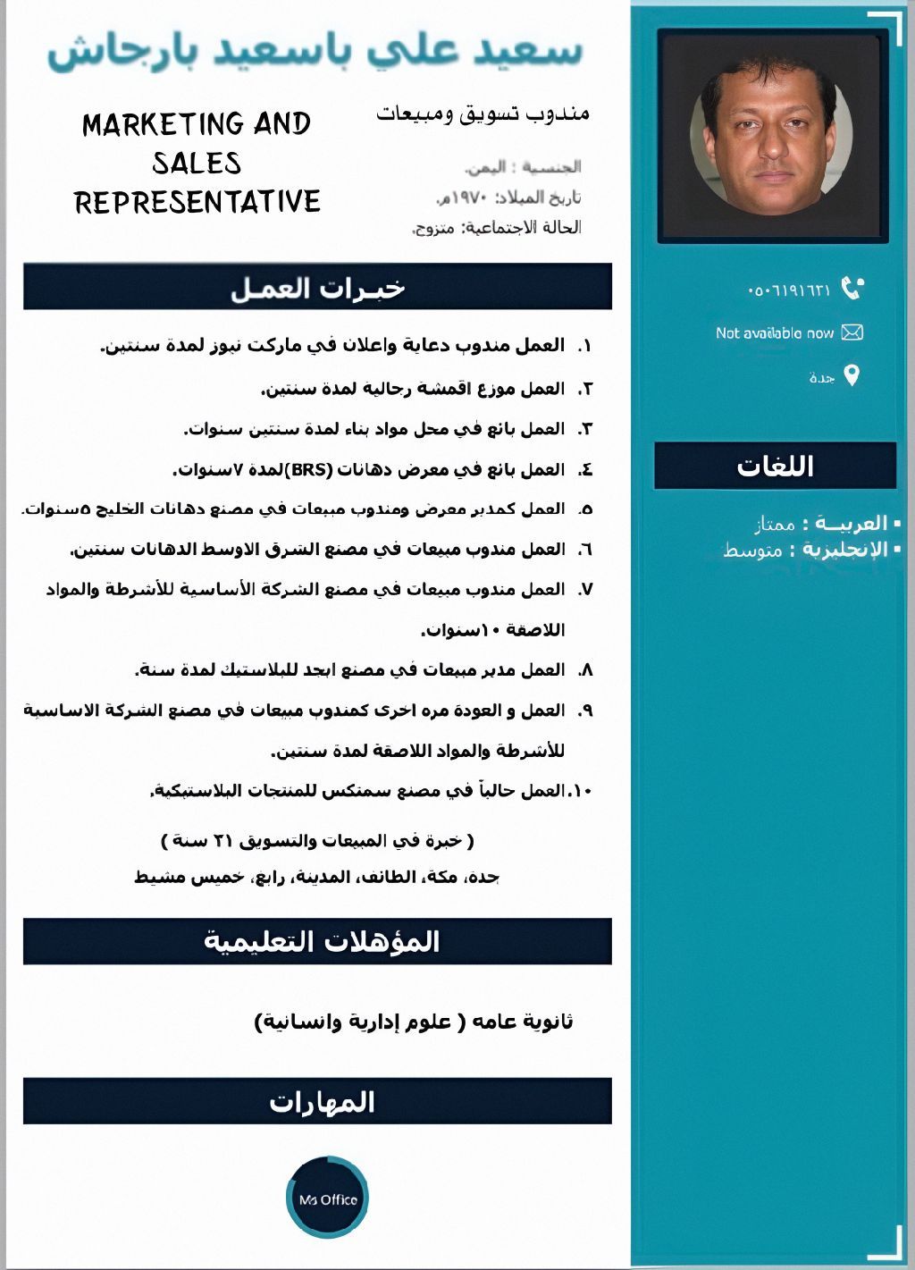 الاسم/ سعيد علي بارجاش مقيم من مواليد السعودية خبرة في التسويق والمبيعات 31 عام بيع مباشر علاقات مع العملاء تطوير المبيعات بيع جملة