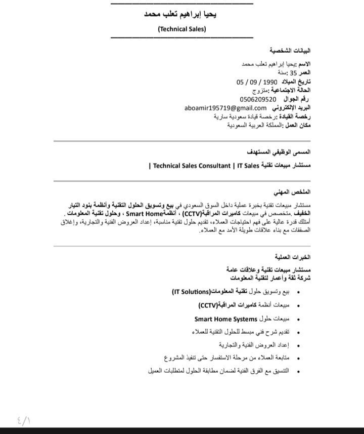 مصري السن (35) ليسانس) ابحث عن عمل في مجال المبيعات والتسويق لدي خبرة كافية للعمل. العمل من قبل استشاري مبيعات وعلاقات عامة في مجال الا سمارت هوم والتيار الخفيف في كلا من شركة (ثقة واعمار - الرابح) مسؤول مبيعات وحركة في شركة سالم عبوش للخرسانة الجاهزه. موظف استقبال في فندق درة المتميزون. خبرة بسيطة في مجال الاعاشة. مستعد للانتقال الى أي مكان في المملكة. إقامة سارية قابلة للتحويل. رخصة قيادة سارية
