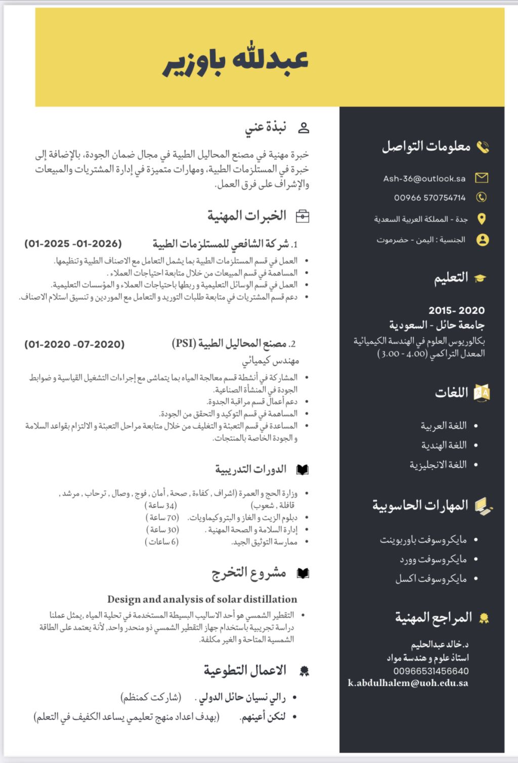 أسعى لتقديم قيمة مضافة مستمرة للمؤسسة، أسعى للانضمام الى عمل متعاون أساهم فيه بخبرتي التقنية والادارية، أمارس اللغة العربية والهندية واللغة الانجليزية، الجنسية اليمن - حضرموت، ذو خبرة في قسم الجودة في مصنع المحاليل الطبية وأيضا خبرة في إدارة المبيعات والمشتريات، وخبرة في المستلزمات الطبية