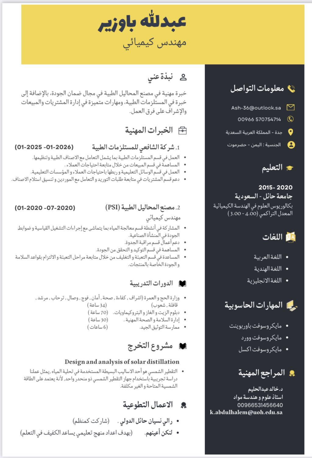 أمارس اللغة العربية والهندية واللغة الانجليزية أسعى للانضمام الى فريق عمل متعاون أساهم فيه بخبرتي التقنية والادارية، مع مواصلة التعلم والنمو والتميز المهني وتقديم قيمة مضافة مستمرة للمؤسسة، ذو خبرة في مصنع المحاليل الطبية قسم الجودة، خبرة في المستلزمات الطبية، وأيضا خبرة ادارية وخبرة في ادارة المبيعات والمشتريات