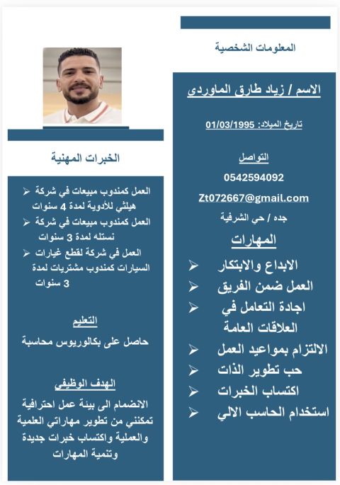 أنا زيد، شغوف بعالم العطور والتجميل وأملك ذوقا عاليا في تنسيق الروائح واختيار المنتجات التي تعكس الأناقة والجمال ابحث عن فرصة عمل في هذا المجال المميز سواء في المبيعات أو التسويق أو خدمة العملاء حيث يمكنني توظيف خبرتي وحسي الجمالي لتقديم تجربة راقية للعميل أتميز باللباقة والاهتمام بالتفاصيل وحب التعلم والتطور المستمر في عالم الجمال والعطور أتطلع للانضمام الى فريق