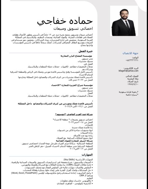 مدير مبيعات خبرة 10 سنوات في السوق السعودية، متخصص في الاشراف على فرق المبيعات وتطوير الأداء، ووضع الخطط الاستراتيجية التسويقية لزيادة المبيعات وتوسيع قاعدة العملاء. محترف في قيادة الفرق وتحفيزهم لتحقيق الأهداف، واجادة أنظمة Odoo وبرامج Microsoft Office. امتلك رخصة قيادة سعودية وإقامة مندوب مبيعات سارية