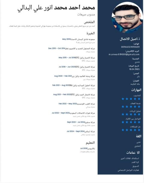 أخصائي دعم فني وخدمة عملاء بخبرة 4 سنوات في الدعم التقني، المبيعات، والتشغيل متميز في التواصل الفعال حل المشكلات، وتنظيم العمل، وأسعى لفرصة مهنية أساهم من خلالها في تحقيق أهداف المنشأة وتطوير أدائي الوظيفي