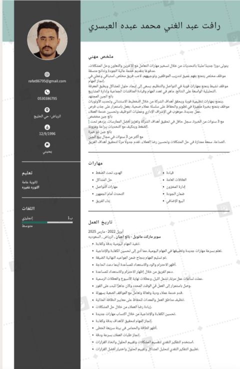 اسمي علي مصطفى مندوب مبيعات خبرات العمل السابقة 1 مستحضرات التجميل 2 بيع جوالات وأكسسوارات خبرة داخل المملكة 4 سنين يوجد. سيارة وإقامة سارية المفعول