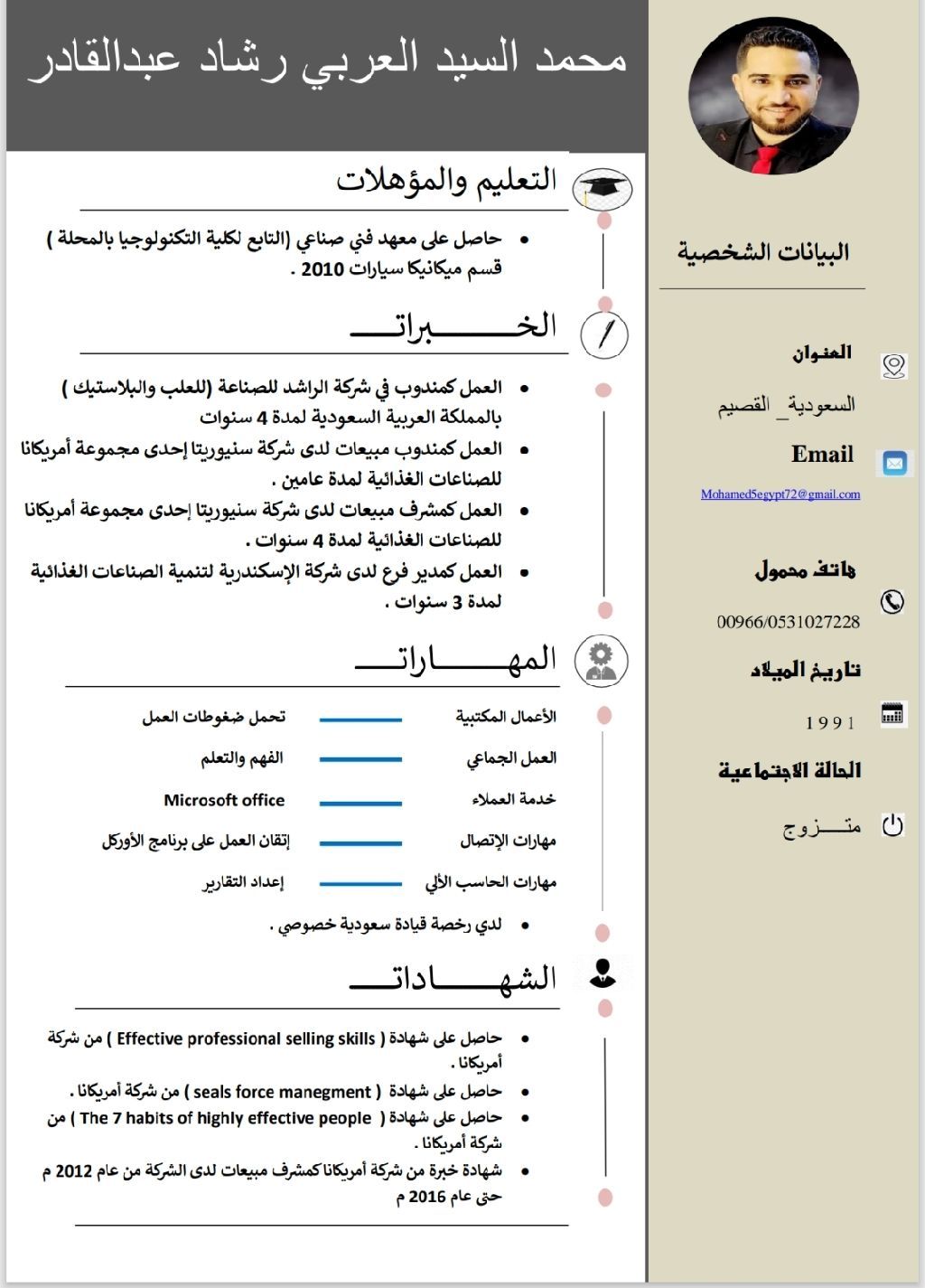 ابحث عن وظيفة مشرف مبيعات لدي خبرة بمجال المبيعات أكثر من 15 سنة منهم 5 سنوات في السعودية في مجال البلاستيك والعلب ومنهم في مصر 8 سنوات بمجال المواد الغذائية (الشيبس - والحلويات - والبسكويت) بحوزتي رخصة قيادة سارية لدي القدرة على العمل بالبرامج التطبيقات والأوفيس وعملت على برنامج الاوراكل وعملت بمنطقة القصيم وبعض أماكن الرياض مثل العزيزية والسلي وعتيقة وغيرها وحاليا اعمل كمشرف مبيعات في شركة مياه