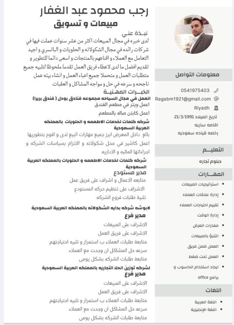 مصري الجنسية السن 33 سنة خبرة عشر سنوات في المبيعات داخل المملكة العربية السعودية عملت فيهم وايتر في مجال السياحة والفنادق. برايرا) ثم في مجال الشكولاته في 3 شركات مختلفه بائع كاشير. منسق صواني شكولاته مدير مستودع مشرف معرض شكولاته عندي خبرة في المجال من زواجات الكيك أقامه سارية ورخصة قيادة سارية شهادة صحيه