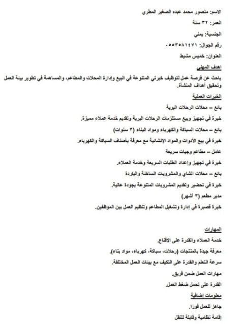 لاسم حمزة محمد نعمان مكان الإقامة الرياض الهدف الوظيفي معلم مشاوي وبائع ذو خبرة، في مجال العمل 3 سنوات ابحث عن فرصة عمل مناسبة أستطيع من خلالها استثمار خبرتي العملية، وتقديم أفضل جودة في العمل وخدمة العملاء، والمساهمة في نجاح المنشأة