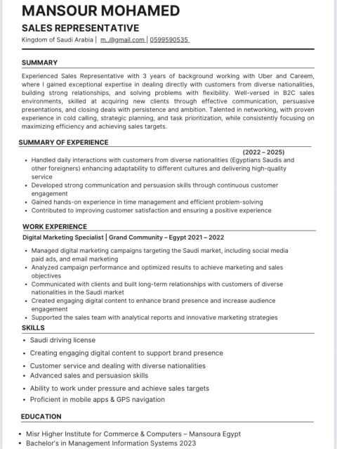 خبرة 3 سنوات في مجال المبيعات وخدمة العملاء عملت مع شركات كبرى مثل Uber وCareem وعندي خبرة قوية في التعامل مع عملاء من جنسيات مختلفة، وتحقيق أهداف البيع، وبناء علاقات طويلة المدى مع العملاء