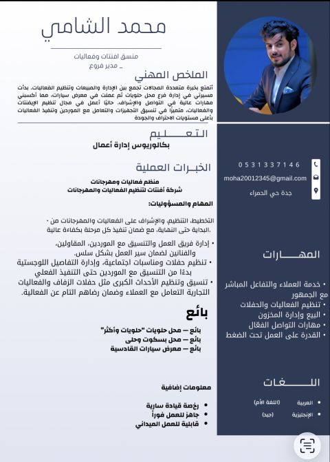 أتمتع بخبرة متعددة المجالات تجمع بين الإدارة والمبيعات وتنظيم الفعاليات. بدأت مسيرتي في إدارة فرع محل حلويات ثم عملت في معرض سيارات، مما اكسبني مهارات عالية في التواصل والاشراف. حاليا اعمل في مجال تنظيم الإيفنتات والفعاليات، متميزا في تنسيق التجهيزات والتعامل مع الموردين وتنفيذ الفعاليات بأعلى مستويات الاحتراف والجودة