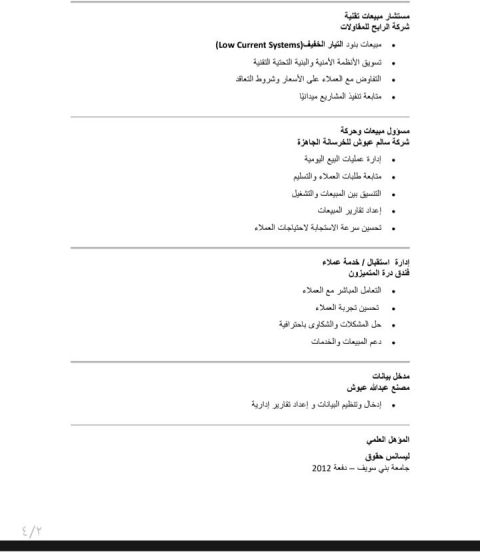مصري السن (35) سنة ابحث عن عمل في مجال المبيعات والتسويق لدي خبرة كافية للعمل. العمل من قبل استشاري مبيعات وعلاقات عامة في شركة ثقة واعمار في مجال الا سمارت هوم والتيار الخفيف واستشاري مبيعات في شركة الرابح في مجال التيار الخفيف وأيضا مسؤول مبيعات وحركة في شركة سالم عبوش للخرسانة الجاهزه وموظف استقبال في فندق درة المتميزون. رخصة قيادة سعودية جاهز للعمل الفوري مستعد للانتقال الى أي مكان في المملكة