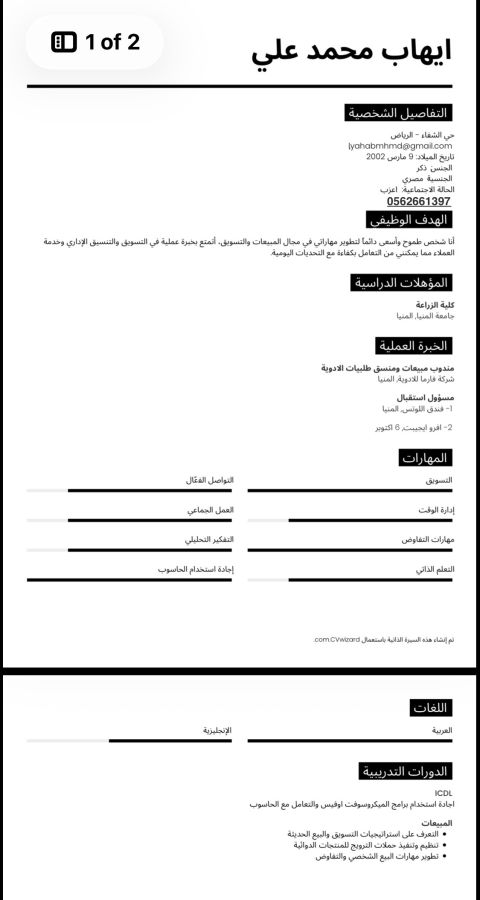 محمود الجنسية مصري ابحث عن فرصة عمل في مجال المبيعات أو المشتريات خبرة 4 سنوات مسؤول مشتريات في مواد البناء والاجهزة الكهربائية والالكترونية والسلع الغذائية. وخبرة 7 سنوات في المبيعات In Door/ Out Door. خبرة في مبيعات الاجهزة الالكترونية (جوالات) وأكسسوارات الجوالات ومبيعات المنظفات. يوجد معي إقامة سنة قابلة للنقل لدي القدرة على التفاوض، والتعامل المباشر مع العملاء. ملتزم، منظم، متفرغ للعمل فورا