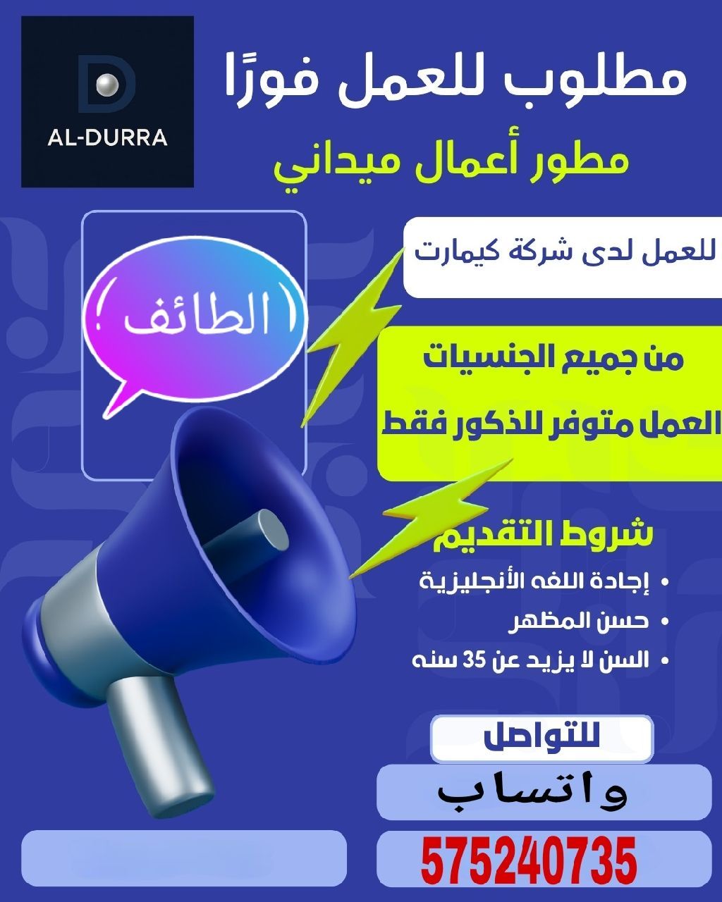 مطلوب مسوقين مبيعات في (الطائف) ميدانيين للانضمام الى فريقنا الشروط العمر لا يتجاوز 35 عام. التواجد داخل نفس المدينة المتقدم عليها. يفضل وجود خبرة في مجال المبيعات أو العمل الميداني. القدرة على التواصل باللغة الانجليزية بمستوى جيد