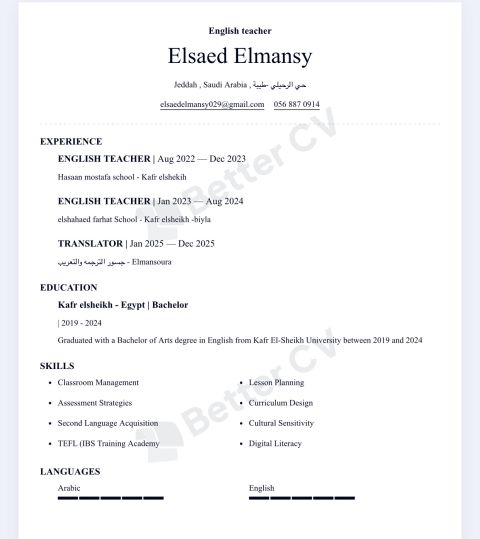 بكالوريوس القانون بخبرة 5 سنوات في الدعم الاداري والقانوني في مصر والسعودية أتمتع بمهارة في خدمة العملاء، تنظيم المستندات إدارة العقود، الامتثال القانوني، واستخدام المنصات الحكومية كمقيم، قوي وغيره، كتابة الخطابات وتنظيم الاجتماعات، أجيد اعداد التقارير والعروض التقديمية باستخدام Microsoft Office وCanva، أتميز بالتنظيم الدقيق، المرونة، إدارة الوقت، القدرة على التكيف، والتطوير المستمر، مقيم في جدة