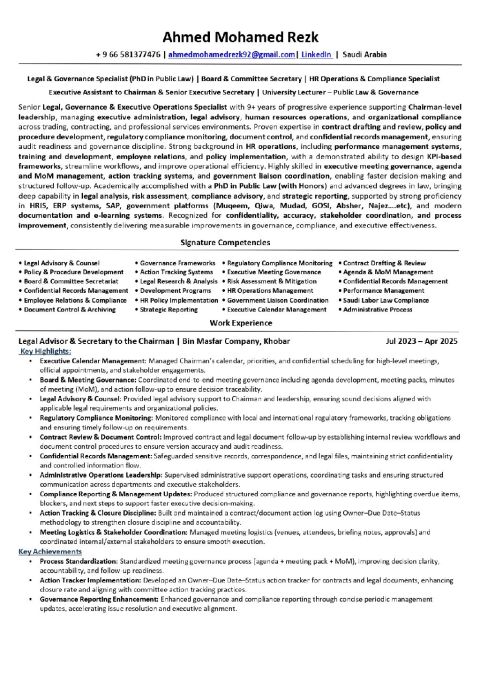 I am seeking a role as Executive Secretary/ Board & Committee Secretary/ legal Secretary/ HR or Legal Specialist/ University Lecturer. PhD in Law, with strong experience in executive support, governance follow - up, minutes and reports, legal drafting, and HR operations. Proficient in Saudi government platforms. Transferable Iqama. Ready to join immediately