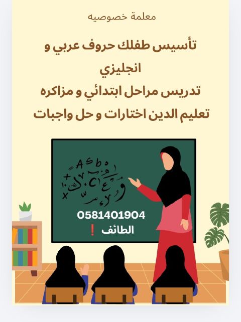 معلمه خصوصي جميع مواد الابتدائي تلاحظ فرق طفلك من أول أسبوع مدرسي حضوري منزل الطفل أو منزلي الطائف
