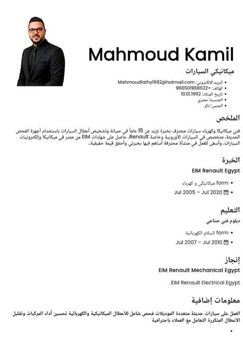 فني ميكانيكا وكهرباء سيارات واعمل علي اجهزة الفحص وحاصل على شهادات معتمدة من Renault Egypt، أسعى للعمل في بيئة احترافية تتيح لي تطوير مهاراتي والمساهمة في تحسين جودة الصيانة والخدمة الفنيه