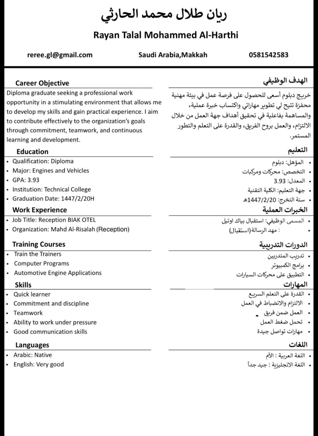 يوجد عندي معلومات كافية بالميكانيكا والكهرباء متوسط المعلومات عندي اعتماد مهني من هيئة المهندسين سعودي الجنسية