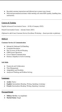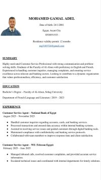 ابحث عن فرصة عمل في مجال السياحة والفنادق، خريج لغات وترجمة قسم اللغة الفرنسية ولدي مستوى جيد جدا في اللغة الانجليزية، لدي اللباقة والتعامل الجيد مع الأخرين والتعامل مع العملاء، حيث لدي خبرة سابقة في مجال خدمة العملاء، الإقامة سارية لمدة 12 شهر