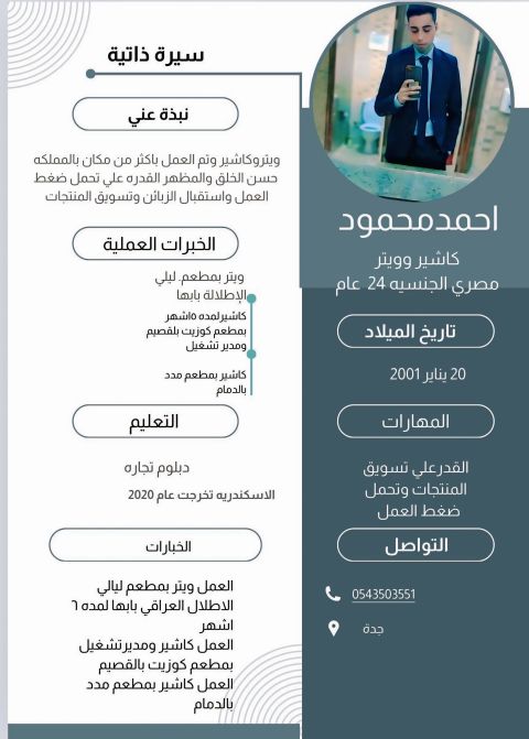 كاشير ووايتر مصري الجنسية 25 عام تم العمل بأكثر من مكان بالمملكة يجيد العمل تحت الضغط والقدرة علي تنفيذ المهم المطلوبه بشكل احترافي ابحث عن عمل