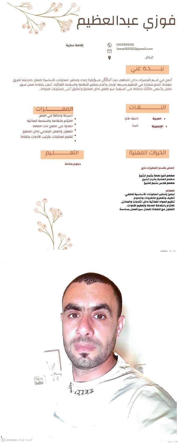 مساعد شيف خبرة خمس سنوات أجيد العمل تحت ضعظ مع السرعة والنضافه والباقي في التحدث والعمل تحت ضغط