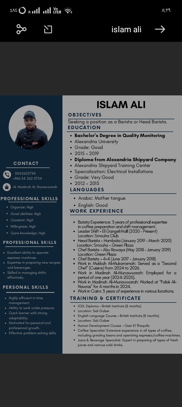 شيف باريستا خبرة 5 سنين خبرة في عمل أنواع القهوة المختصه والعصائر كلها خبرة في الرسم علي القهوة
