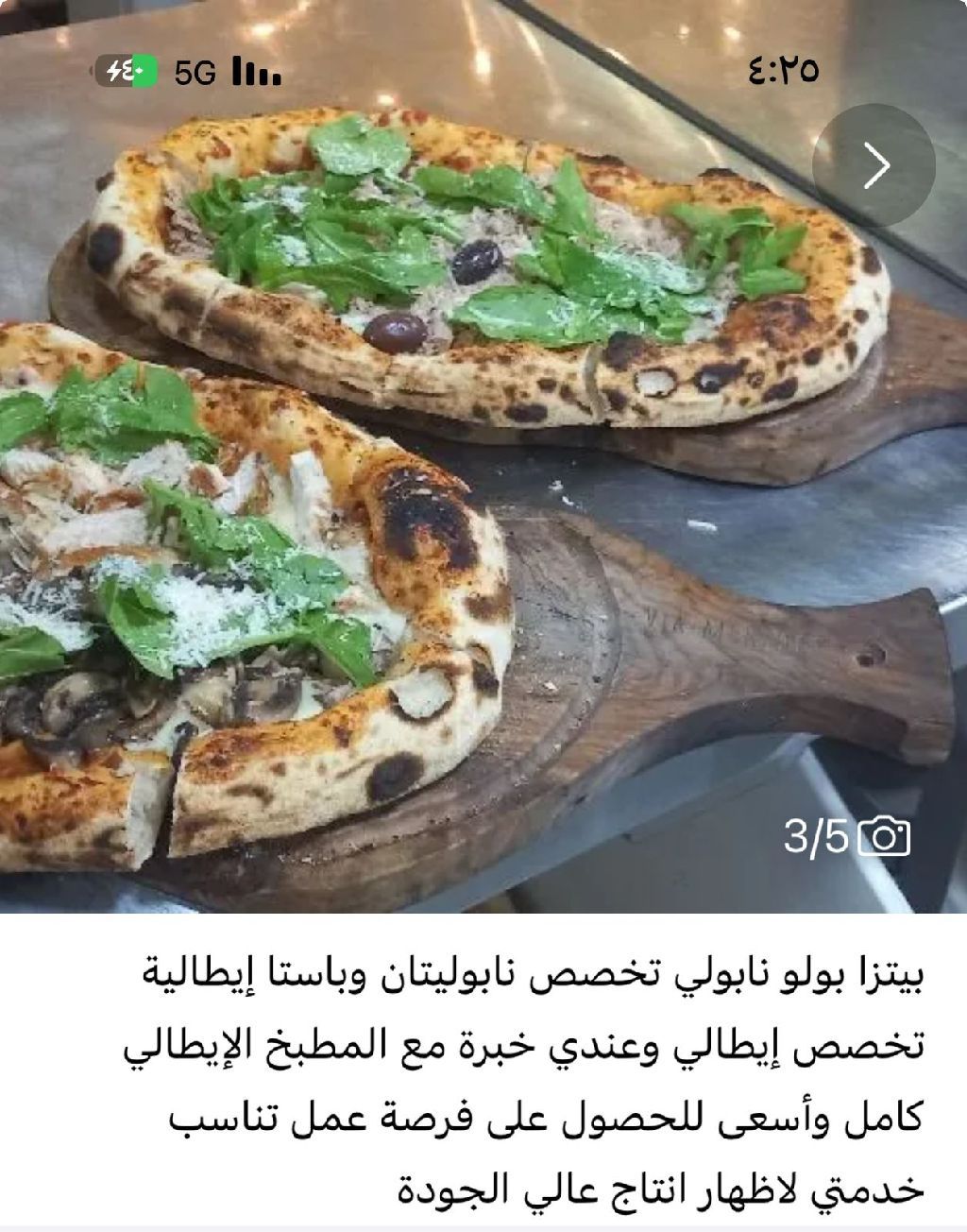 بيتزايولو نابوليتان خدمة نابولي وباستا إيطالية تخصص مطبخ إيطالي وأسعى للحصول علي فرصة عمل مناسبة لاظهار المطلوب