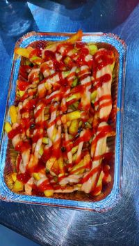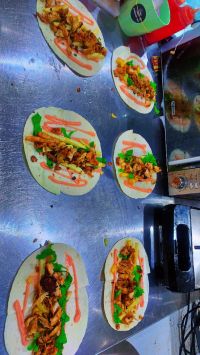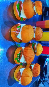 There is a fast food chef offering burgers, zinger, fajitas, kudos, tacos, leoni chicken fries, shawarma, saj, falafel, sauces, and all kinds of sandwiches