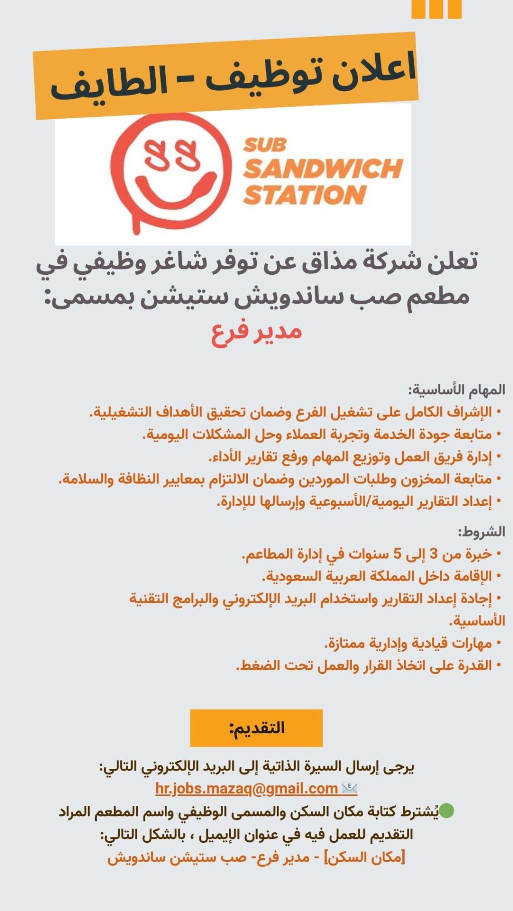 تعلن شركة مذاق عن توفر شاغر وظيفي في مطعم صب سندويش ستيشن بمسمى مدير فرع الموقع الطائف - حي الحوية المهام الأساسية الاشراف الكامل على تشغيل الفرع وضمان تحقيق الأهداف التشغيلية. متابعة جودة الخدمة وتجربة العملاء وحل المشكلات اليومية. إدارة فريق العمل وتوزيع المهام ورفع تقارير الأداء. متابعة المخزون وطلبات الموردين وضمان الالتزام بمعايير النظافة والسلامة. اعداد التقارير اليومية / الأسبوعية