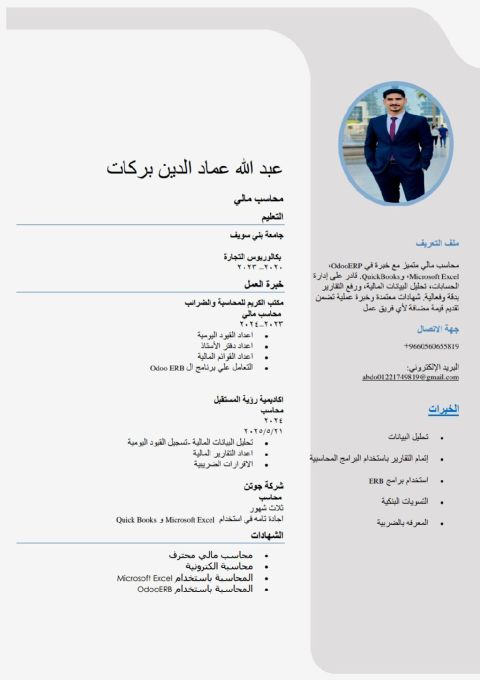 محاسب مالي بخبرة في اعداد التقارير المالية، متابعة الحسابات الاقرارات الضريبية، والمطابقة البنكية. خبرة عملية على برامج Excel وOdoo Accounting. عملت في مصر وجاهز للعمل فورا في السعودية بدوام كامل أو جزئي خبرة سنتين في مصر و3 شهور بالمملكة