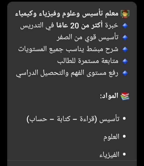 معلم خبير في التأسيس والعلوم والفيزياء والكيمياء لجميع المراحل متواجد في الرياض حي اليرموك أو النسيم حضوري