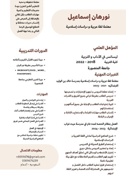 معلمة لغة انجليزية بخبرة تزيد عن 7 سنوات، حاصلة على بكالوريوس آداب انجليزي بامتياز وأتمتع بمستوى متقدم في اللغة. أطبق أساليب تعليمية حديثة وتفاعلية لتعزيز مهارات الطلاب وبناء ثقتهم بأنفسهم، وخلق بيئة تعليمية محفزة تشجع الابداع وتحقق تقدما واضحا في الأداء الأكاديمي واللغوي. حاليا ابحث عن فرصة للعمل في بيئة تعليمية متميزة داخل الرياض
