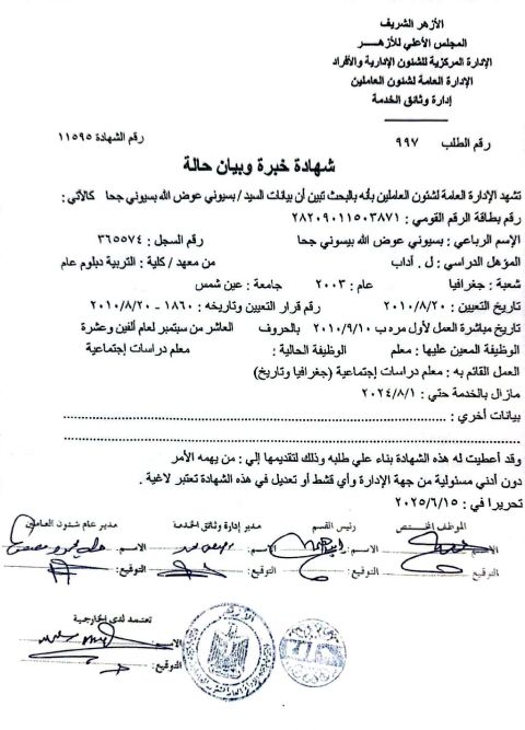 معلم دراسات اجتماعيه (جغرافيا وتاريخ) حاصل على دبلوم عام في التربية وحاصل على دراسات عليا خبرة 15 عام في التدريس بالأزهر الشريف