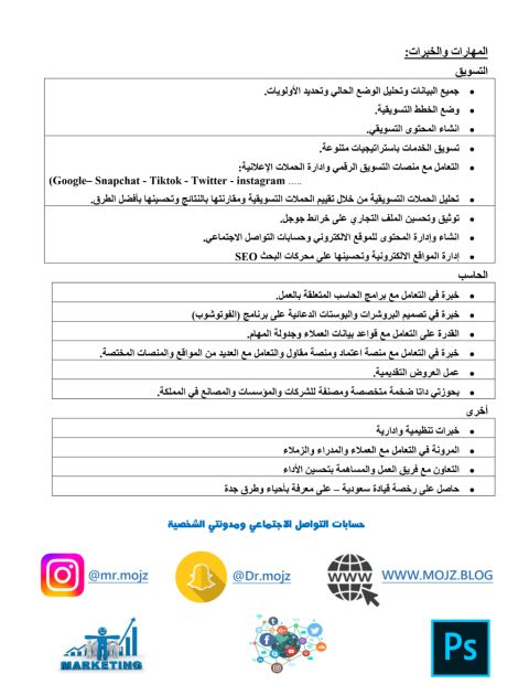 اختصاصي تسويق يبحث عن فرصة عمل متخصص في التسويق للخدمات. جمع وتحليل البيانات وتحديد الأولويات - وضع الخطط التسويقية - ادارة الحملات الاعلانية - ادارة المواقع الالكترونية وتحسينها - ادارة وتحسين الملف التجاري على خرائط جوجل - تصميم البروشورات الاعلانية (فوتوشوب) انشاء المحتوى - الابتكار التسويقي - تنسيق المناقصات - خبرات ادارية متنوعة - محترف في جمع الداتا المتخصصة