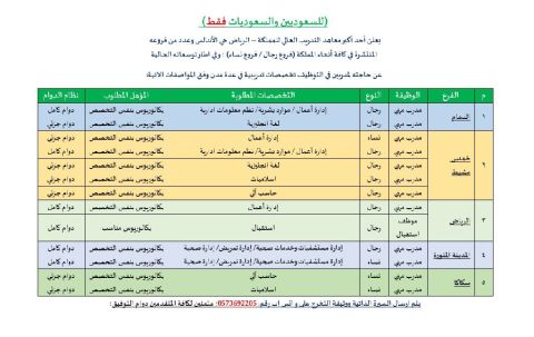 للسعوديين والمصريين، مطلوب فورا للعمل بنظام التعاقد المحدد بمدة (غير مطلوب نقل كفالة لغير السعوديين) لدى أكبر معاهد التدريب العالي في الدمام حي الزهور، مدربين في التخصصات الآتية سلامة وصحة بيئة / هندسة طاقة / كيمياء. يشترط الحصول على OSHA أو NEBOSH. يتم إرسال السيرة الذاتية على الواتساب مرفق معها الوثيقة (شهادة المؤهل الدراسي)
