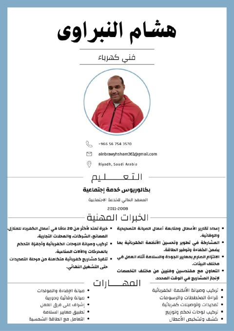 كهربائي مصري خبرة 20 سنة في صيانة وتركيب الكهرباء للمنازل والمصانع والمحلات التجارية والشركات. متخصص في جميع أعمال الكهرباء (تمديدات - انارة - لوحات - تصليح أعطال) مقيم في الرياض، جاهز للعمل الفوري باليومية فقط. دقة في العمل وسرعة في التنفيذ. للتواصل واتساب أو اتصال متاح 24 ساعة