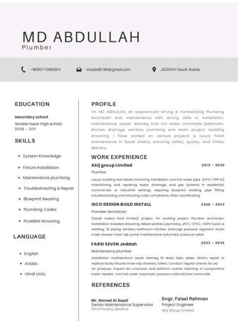 I am an electrician with 2 years of experience in Saudi Arabia in installing cable ducts, PVC pipes, EMT pipes, residential wiring, factory wiring, as well as installing and maintaining surveillance cameras and fire alarm systems. and I have one year computer operator experience
