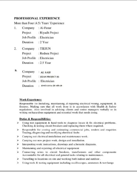 Electrician working under a unified contract. Responsibilities include correcting overhead power lines, field surveying, AutoCAD drafting, excavation work, numbering and Excel work, wiring, maintenance, wiring modifications, meter replacement, underground wiring in projects, overhead and underground thermal testing, warning labeling, and source identification