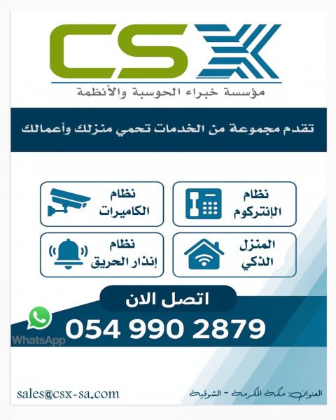 مرحبا بكم. كاميرات مراقبة للمحلات والمنازل والمكاتب والمستودعات شبكات سلكية ولاسلكية اجهزة كمبيوتر وسيرفرات اجهزة اتصالات سنترالات اجهزة انذار ضد السرقة اجهزة بصمة اجهزة انتركوم للبيوت تركيب، توريد، صيانة، تشغيل، برمجة جميع الأنظمة في المراقبة والأمن والحماية، شبكات، حلول انترنت، اتصالات، سيرفرات، حواسيب وغيرها في التقنية والمعلومات والبيانات