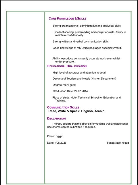 My name is Fouad Ihab I have experience in Kofta Restaurant as work Restaurant Manager Hypermarkets as work Manager fresh food in Lulu Saudi and merchandising in many supermarkets in Egypt like Carrefour city center alexandria Finally I attached my CV so I look forward to read my CV